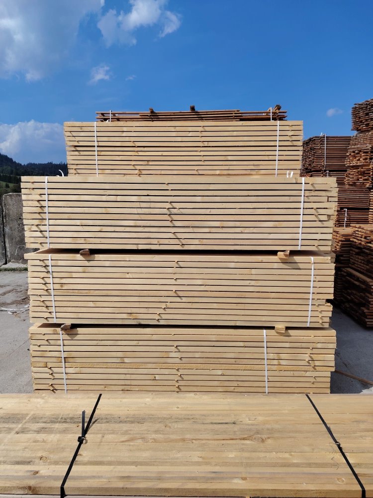 4-stranne hobľované hranoly a dosky zo smrekového dreva, pripravené na natieranie alebo ďalšie povrchové úpravy.